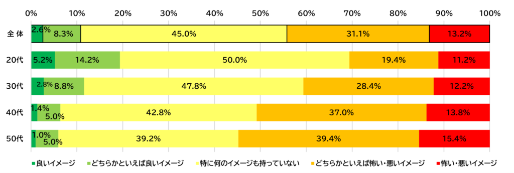 【1】若年層ほど好意的または中立的なイメージが多く、20代では約7割に到達