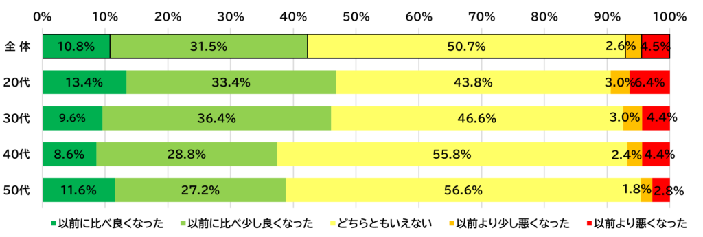 遺伝子組み換え食品についてどのようなイメージを持っているかとの問いに「特に何のイメージも持っていない」と答えた人が最も多く、全体の45%でした。年代別では、若年層ほど否定的な回答が少なく、20代では「良い」「どちらかといえば良い」(好意的)と「特にイメージなし」(中立的)の合計が約7割を占めています。
