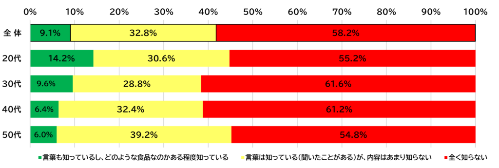 【4】ゲノム編集食品の認知度は広がりを見せず、全体の58%が「全く知らない」ゲノム編集食品については、全体の2%が「全く知らない」と回答し、内容まで理解している層はわずか9.1%にとどまりました。年代別に見ても「全く知らない」という回答が20代~50代のすべてで過半数を占めており、年代に関わらず、ゲノム編集食品についての知識が広く行き渡っていないことが分かりました。また、全体の51.2%が「全く知らない」と回答した前回(2021年)の調査結果と比べても、認知度は広がっていませんでした。